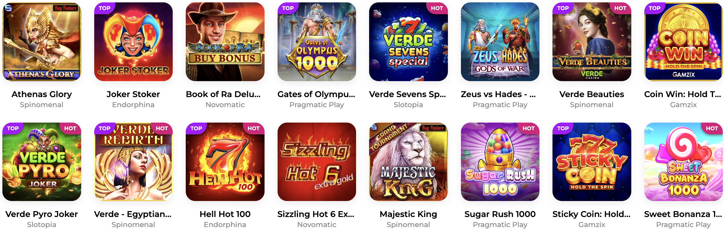 Gry, które są głównie w Verde Casino, można podzielić na wiele kategorii jako automaty; z podstawowymi, wideo i progresywnymi. Popularne tytuły obejmują:
